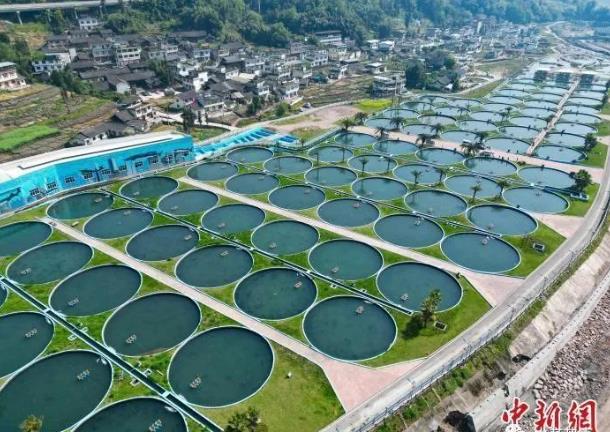 在天全县水产现代农业园区(简称园区),200余个圆形流水鱼池依河而建,通过无人机俯瞰,鱼池池水碧绿,仿佛整齐排列的绿宝石。水池中,一条条体型壮硕、重达百斤的鲟鱼摆尾游动。据园区负责人、四川润兆渔业有限公司(简称润兆渔业)养殖生产技术总监李强介绍,一条鲟鱼生长8至12年,才能产出优质鱼子酱。