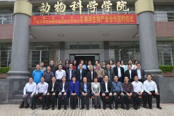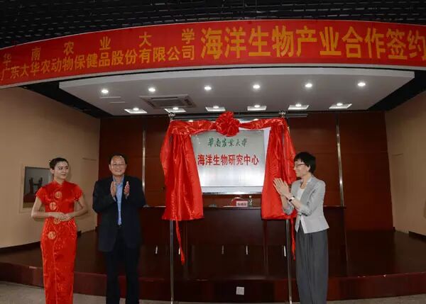 3月17日,广东大华农动物保健品股份有限公司与华南农业大学“海洋生物产业合作签约暨华南农业大学海洋生物研究中心揭牌仪式”在华南农业大学举行。华南农业大学校长陈晓阳和大华农副董事长兼总裁陈瑞爱共同为华南农业大学海洋生物研究中心揭牌,刘雅红副校长和陈瑞爱总裁代表校企双方签订了关于海洋生物产业的合作协议。双方将以此为契机,探索“海上温氏”校企合作的新模式,推动海洋生物学科建设、专业团队培养和产业发展,更好地服务广东乃至全国的海洋事业发展,为海洋产业注入更多的新技术、新成果和新团队,为实现国家“一路一带”战略构想做出贡献。