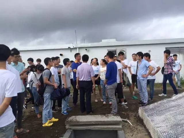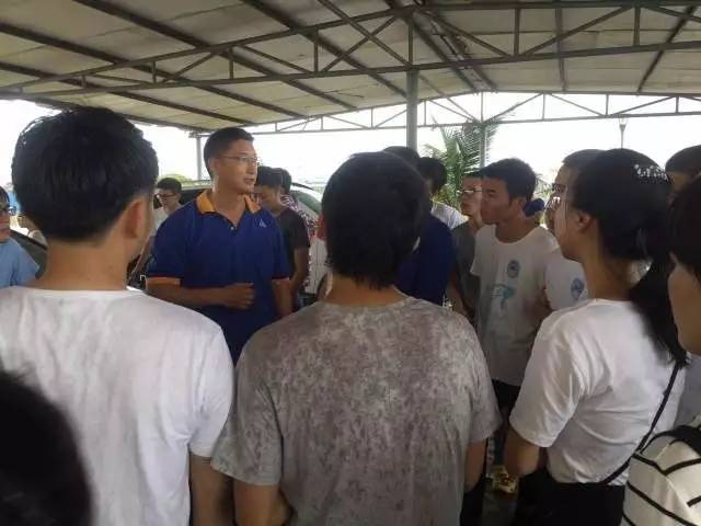 尽管天公不作美,下起了毛毛细雨,可当学生们走进基地时,基地员工的热情,两旁迎风摇曳的椰树、道路中间开得正欢的鲜花,以及不远处清晰可见的厂房,都激发了大家的兴趣,丝毫不见阴雨带来的不快,只有一路的笑语。还刚进门口,学生们就迫不及待了,不断地向陶场长发问。雨势突然变大,大家只好躲进停车棚。趁着这个机会,陶场长就基地的发展史、规模、产能、育苗理念做了解说,并重点介绍利洋苗繁育过程,告诉大家利洋苗的培育是生态的,全程投喂天然的生物饵料,绝不使用抗生素。尤其是生态苗,更是利洋特色,是一种从无节幼体到仔虾都在室外大塘培育,利用池塘生态环境定向培养的饵料生物的育苗方式。陶场长介绍的一切开阔了大家的视野,让大家感受到了书本知识的局限和实践的广阔,学生们的好奇心和求知欲倍增,恨不得马上冒雨到场区看个究竟。
